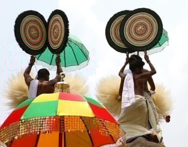 Kudamattom (Umbrella Exchange Ceremony): The most photogenic event! Competing teams from Paramekkavu and Thiruvambady temples rapidly swap vibrant, sequined umbrellas on elephants to the beat of drums – a dazzling display of rhythm and colour.